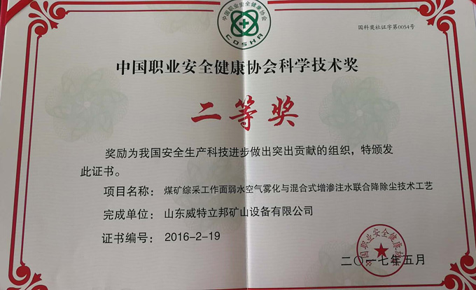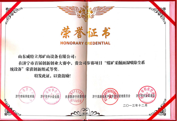 濟寧市首屆創(chuàng)新大賽“煤礦采掘面濕噴除塵系統(tǒng)設備”創(chuàng)新組二等獎